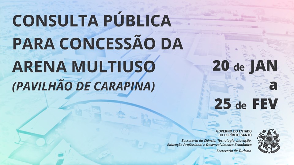 O Governo do Estado, por meio da Secretaria de Turismo (Setur), anunciou que a Consulta Pública para a Concessão da Arena Multiuso (Pavilhão de Carapina), localizada no município da Serra, está aberta a partir desta quinta-feira (20) e prosseguirá até 25 de fevereiro. Seguindo os princípios da transparência, a população pode registrar sugestões sobre o certame que envolve o principal espaço de grandes eventos do Espírito Santo e terá acesso ao projeto, estudos, informações e à minuta do edital que trata da concessão.