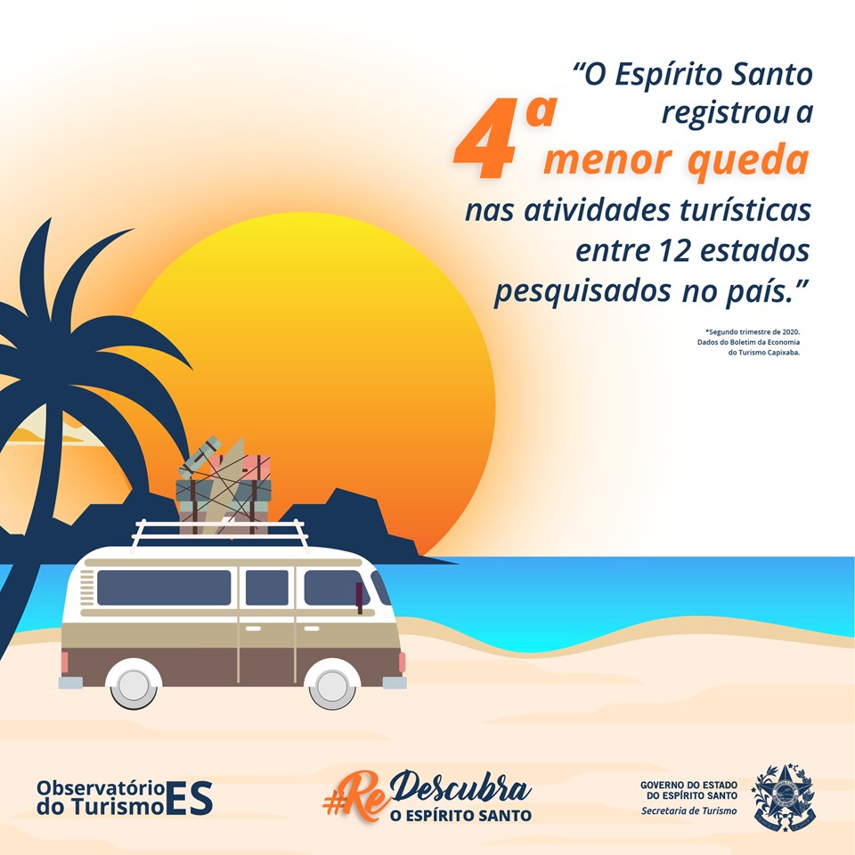 O Espírito Santo registrou a quarta menor queda das atividades turísticas, no segundo trimestre de 2020, entre os 12 estados pesquisados no País. Os dados são do Boletim da Economia do Turismo Capixaba, divulgados na semana passada pela Secretaria de Turismo (Setur) e o Instituto Jones dos Santos Neves (IJSN).