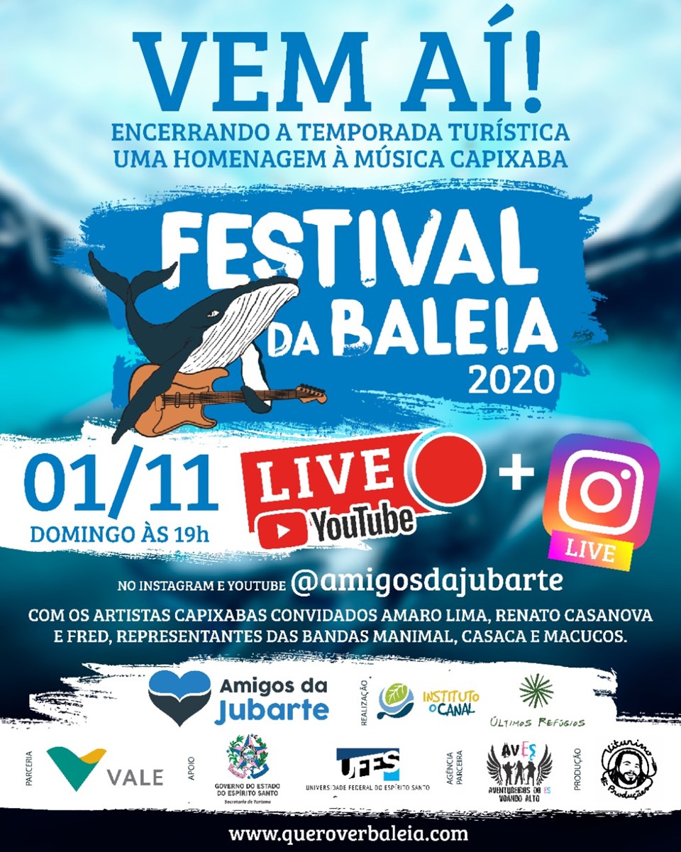 Fechando simbolicamente a temporada em águas brasileiras e o início da migração das baleias jubartes para a Antártica, acontece no dia 1ª de novembro o Festival da Baleia em formato de live. O evento que conta com apoio do Governo do Estado, por meio da Secretaria de Turismo (Setur), homenageará a música capixaba.