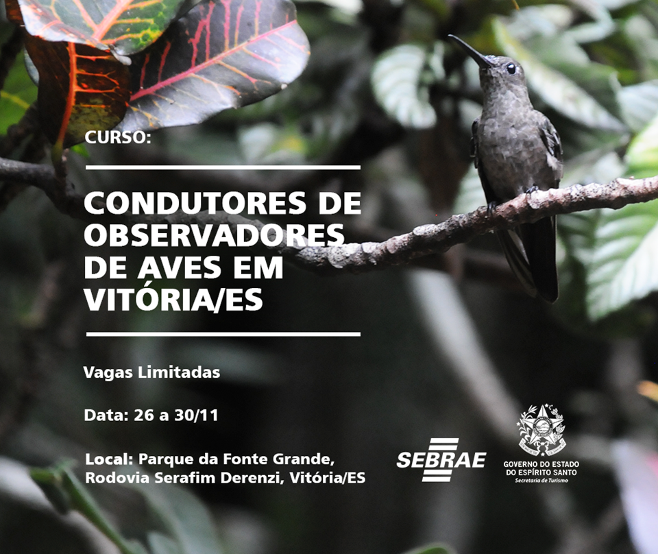 Possui um pequeno negócio que opera serviços no segmento de Ecoturismo e Turismo de Aventura no Espírito Santo? A Secretaria de Estado de Turismo (Setur), em parceria com o Serviço Brasileiro de Apoio às Micro e Pequenas Empresas (Sebrae-ES), abriu as inscrições para o Curso “Condutores de Observadores de Aves em Vitória/ES”. A ação conta com o apoio da Prefeitura Municipal de Vitória/PMV e a Companhia de Desenvolvimento, Inovação e Turismo de Vitória – CDV.