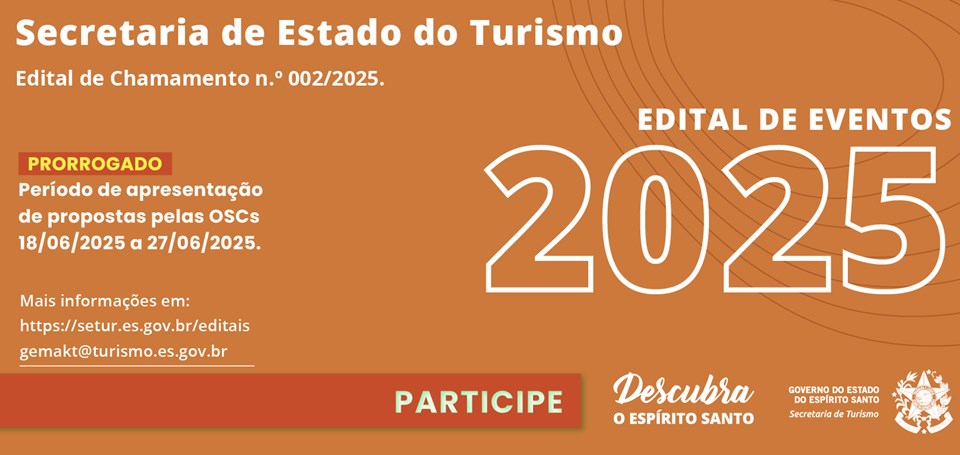 A Secretaria do Turismo (Setur) prorrogou o prazo do Edital de Chamamento Público nº 002/2025, que foi estendido do dia 18 de junho para até esta sexta-feira (27). As inscrições devem ser feitas exclusivamente pela plataforma Acesso Cidadã, por meio do site www.acessocidadao.es.gov.br. O objetivo é selecionar propostas de apoio a eventos promovidos por Organizações da Sociedade Civil (OSCs) sem fins lucrativos que atuam no Espírito Santo.