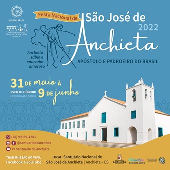 Outro evento que tem apoio do edital promovido pela Setur é a Festa Nacional de São José de Anchieta. A festividade tem início no próximo dia 30 de maio e segue até o dia 09 de junho, Dia Nacional de Anchieta. O evento acontece no Santuário de São José de Anchieta, em Anchieta.