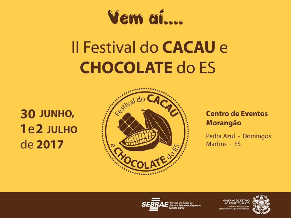 O 2º Festival de Cacau e Chocolate do Espírito Santo começa no dia 30 de junho e segue até o dia 2 de julho, no Centro de Eventos Pedra Azul, conhecido como Morangão.