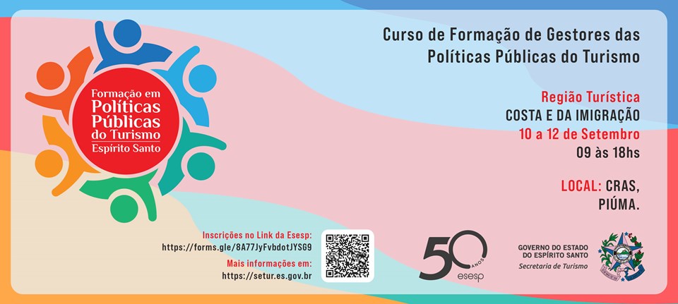 A Secretaria do Turismo (Setur), em parceria com a Escola de Serviço Público do Espírito Santo (Esesp), abre inscrições para a Formação de Gestores das Políticas Públicas do Turismo. Esta edição é voltada para a Região Costa e da Imigração, com realização no município de Piúma.