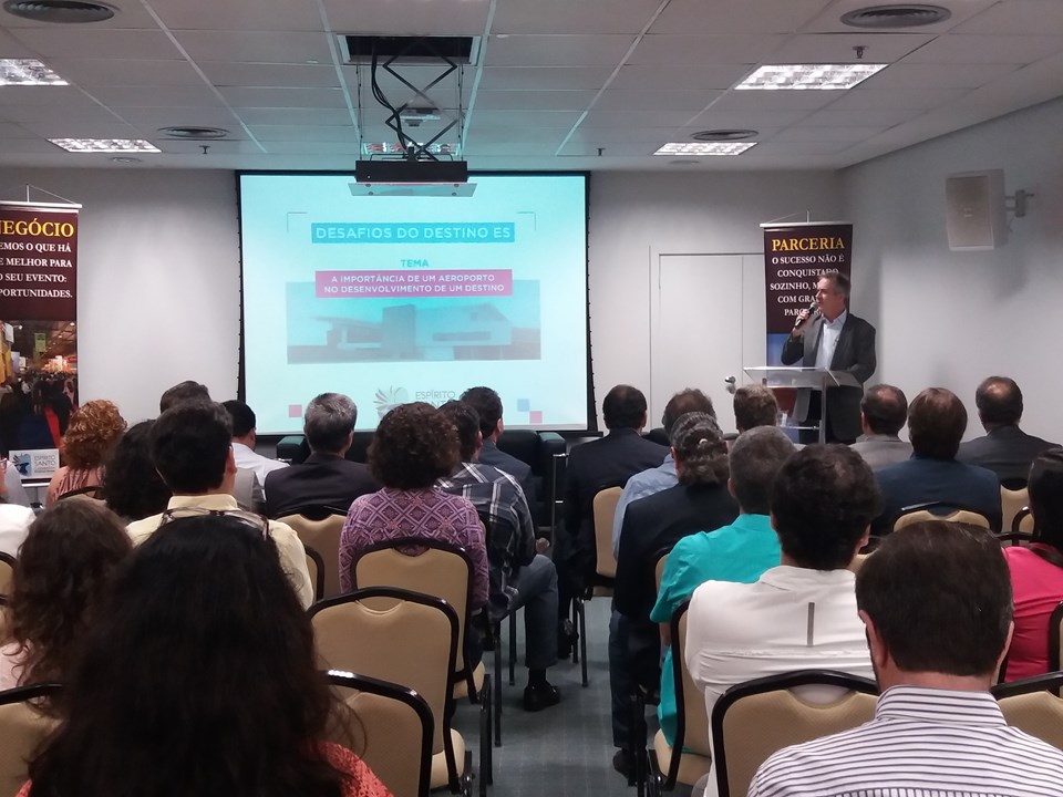 Na manhã de quinta-feira (22/03), o secretário, Nerleo Caus, participou do evento 4º Desafios do Destino ES, com o tema “A importância de um aeroporto no desenvolvimento de um destino”. Também teve na programação a palestra do presidente da Associação Brasileira de Empresas Aéreas (ABEAR), Eduardo Sanovicz. Além do debate sobre o tema do evento com o secretário de Turismo e Afrânio Mar, superintendente da Infraero ES, e Neucimar Fraga, subsecretário de Logística e Transporte do ES, com participação do público.