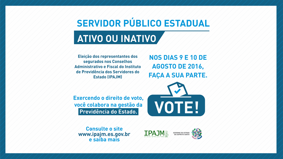 Cerca de 70 mil segurados do Regime Próprio de Previdência dos Servidores do Estado do Espírito Santo (ES-Previdência) – servidores ativos civis e militares e os inativos – terão a oportunidade de eleger seus representantes para atuar nos Conselhos Administrativo e Fiscal do Instituto de Previdência do Estado (IPAJM). Isso porque, de acordo com o edital eleitoral nº 01/2016, publicado nesta segunda-feira (20), nos dias 9 e 10 de agosto será realizada a eleição dos novos membros que farão parte desses colegiados. A votação será facultativa.