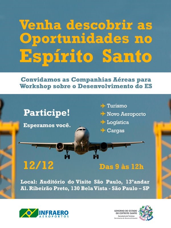 Durante o workshop, os secretários Estaduais de Turismo e Desenvolvimento, Paulo Renato Fonseca Jr. e José Eduardo Azevedo, respectivamente, vão apresentar os projetos desenvolvidos pelo Governo do Estado nas áreas de turismo, logística, economia e agronegócio, para mostrar as oportunidades para as companhias aéreas no Espírito Santo. Já a Infraero vai falar sobre o potencial do novo Aeroporto de Vitória.