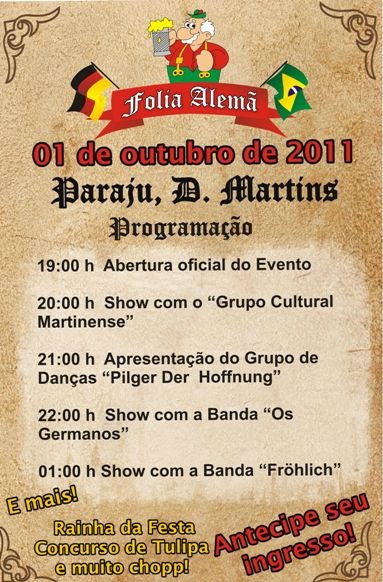 O evento começa às 19 horas e terá shows com o Grupo Cultural Martinense, as bandas Os Germanos e Fröhlich, além do grupo de danças típicas Pilger Der Hoffnung, concurso de tulipa e apresentação da rainha da festa.