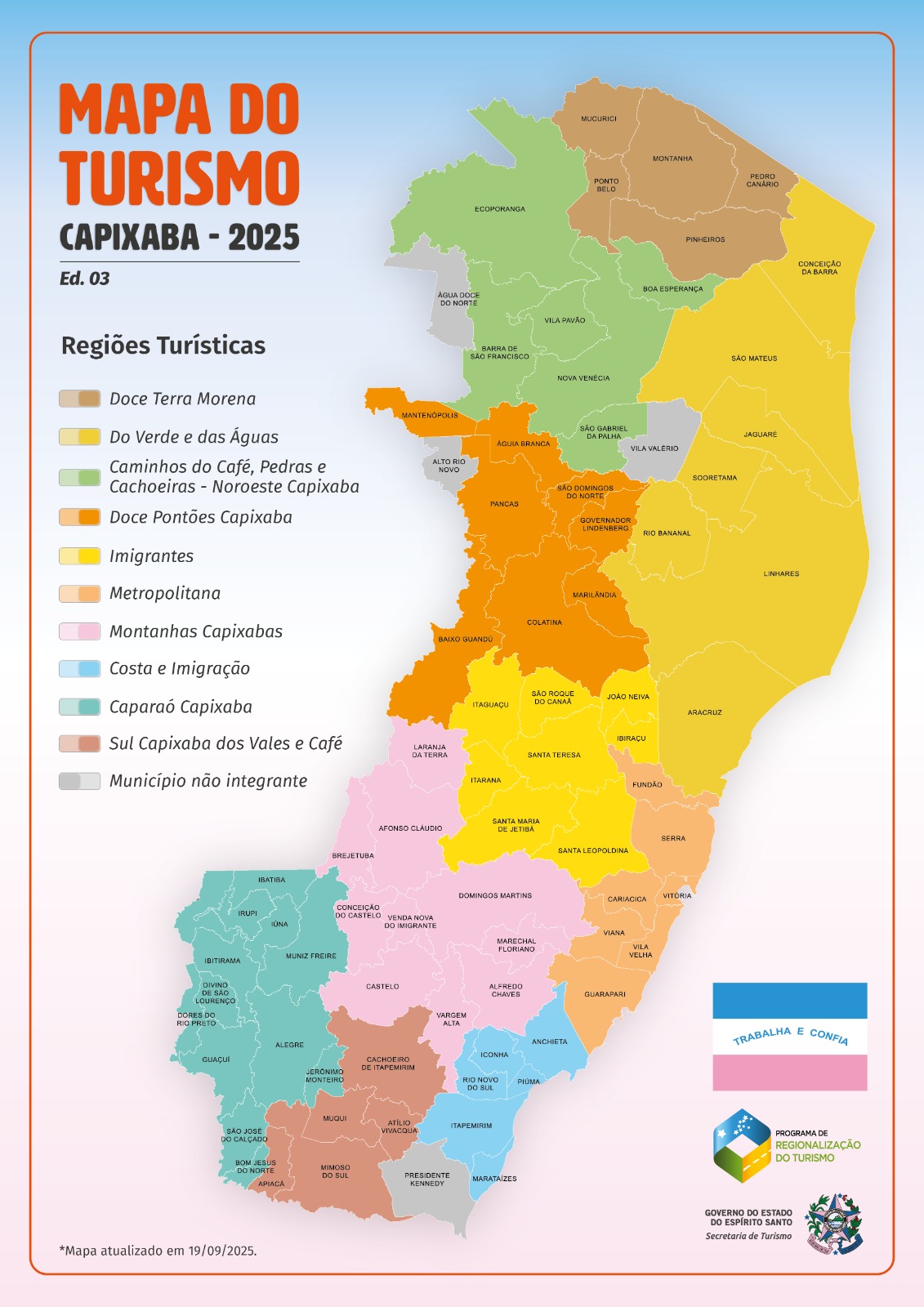 Página Principal Institucional História Missão, Visão e Valores Competências Organograma Perfil do Secretário Subsecretários Agenda do Secretário da Setur Contures Sobre o Contures Legislação Atas Plano Estratégico do Turismo Contato Agenda de Contatos Local e Horário de Atendimento Redes Sociais Perguntas Frequentes Fale Conosco Legislação Licitações Compras Governamentais Licitações Editais Plano de Contratações Anuais Exercício 2026 Exercício 2025 Exercício 2024 Chamamento Público Editais anos anteriores Turismo de Experiência Editais 2025 Processos Seletivos Serviços Cadastur Programa de Qualificação para o Turismo Programa de Regionalização do Turismo Selos Linhas de Crédito Observatório do Turismo Manual de Convênios Calendário de Eventos Pavilhão de Carapina Notícias Eliminação de Documentos Central de conteúdos Galeria de Fotos Galeria de Vídeos Mapa do Turismo 2025 Mapa do Turismo (edições) Regiões Turísticas do ES Mapas, Guias e Folhetos Setur Itinerante E-book Unidade Executora de Controle Interno (UECI) Sobre a UECI-SETUR Normas de Procedimento Programa de Integridade Teletrabalho Comissão de Ética da Setur Sobre a Comissão de Ética Código de Conduta Ética dos Servidores da Setur Comissão de Ética Parcerias (Termo de Fomento e/ou Colaboração) - Convênios (Prefeituras Municipais) Documentação apresentação de proposta Parcerias 2025 Parcerias 2024 Parcerias 2023 Parcerias 2022 Parcerias 2021 Parcerias 2020 Parcerias 2019 Parcerias 2018 Privacidade e Proteção de Dados Legislações Política de Privacidade Política de Privacidade da Recepção / Portaria Direitos do Titular Tratamento de Dados Pessoais Encarregado de Dados Pessoais Acesso à Informação Ações e Programas Contratos Obras Convênios Despesas Servidores Relatórios da LAI Serviço de Informação ao Cidadão (SIC) Ordem Cronológica de Pagamentos