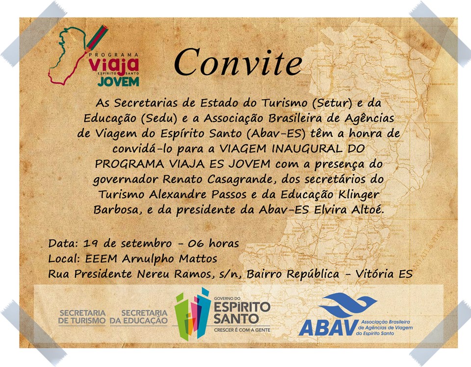 Fruto de um convênio entre a Secretaria de Estado do Turismo (Setur) e a Associação Brasileira das Agências de Viagem (Abav/ES), contando com a parceria da Secretaria de Estado da Educação (Sedu), o Programa Viaja ES Jovem visa valorizar e integrar o conhecimento aprendido em sala de aula com visitas monitoradas às Regiões Turísticas do Espírito Santo e aos seus atrativos.